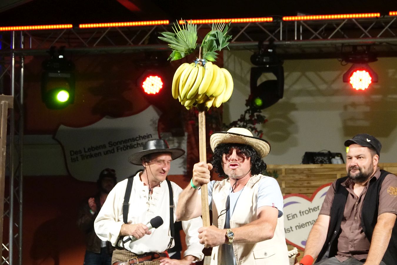 Gleich zu Beginn wurde, die im November bereits erstmals abgehaltene Talkrunde mit Herrn W. Storch, Herrn L. Frosch und Frau Dr. A.M. zur Fortsetzung gebracht und über Gott und die Welt diskutiert. Dabei nahm sich keiner der Herrschaften ein Blatt vor den Mund. Weiter ging es dann mit den Eleven der Kinder- und Nachwuchsgarde, die mit ihrem Blaulichttanz an die vergangene Faschingssaison erinnerten. „Simon and Garfunkel“ gaben sich ebenso die Ehre wie die Power Girls. Wie versprochen gab es auch wie Wiedersehen mit der Männerriege des LCC, gewaltig verjüngt, aber exzellent und gleich danach die erste Girlgroup auf der Freilichtbühne, „The Bangles“. An die großen ABBA-Hits anknüpfend, tanzten später die Mädels der großen Garde ihre Version des Musical Klassikers „Mama Mia“. Das Finale mit anschließendem Feuerwerk stand ganz im Zeichen des Ende August stattfindenden Spencer-Hill-Festivals in unserem beschaulichen Städtchen. Bud und Terence erinnerten mit ihrer kleinen Show an Filmszenen, wo beide mitgewirkt hatten. Mit viel Musik des Bruderduos Guido & Maurizio De Angelis, auch bekannt als „Oliver Onions“, welche die Filmmusiken für die Filme der beiden Haudegen schrieben. In diesem Jahr nun konnten wir auch das große Feuerwerk als krönenden Abschluss bringen und somit den traditionellen Rahmen wieder aufnehmen. Spitzfindige Gäste erzählten sogar, dass aus dem Storchenhorst Beifall der Störche mit Schnabel klappern zu hören war.